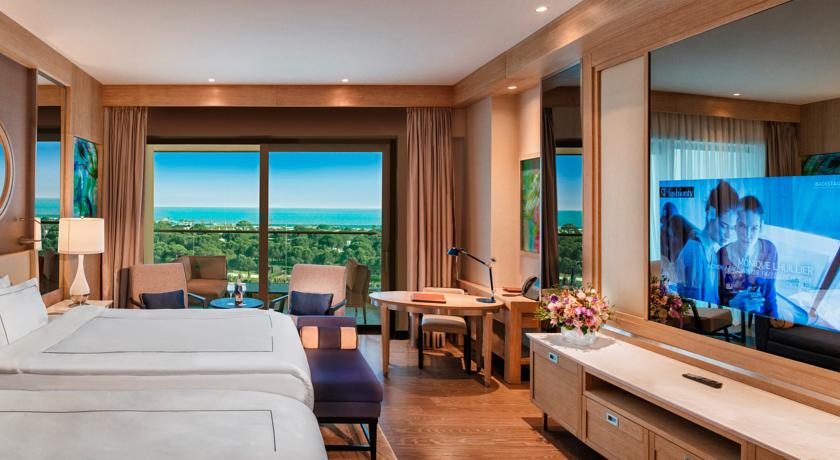 - Отель Regnum Carya Golf & Spa Resort 5* имеет роскошные гольф номера площадью 50 кв. м. и балконом 12 кв. м., роскошные номера с видом на море площадью 50 кв. м. и балконом площадью 12 кв. м., роскошные люксы с видом на море площадью 100 кв. м. и балконом площадью 24 кв. м. (спальня, гостиная и 2 ванные комнаты), семейные номера площадью 85 кв. м. и балконом площадью 24 кв. м. (2 спальни и 2 ванные комнаты), президентский люкс с видом на море площадью 150 кв. м. и балконом площадью 36 кв. м. (2 спальни, гостиная, 2 ванные комнаты). В каждом номере есть французская кровать, гостиный уголок и 2 кресла, телевизор с плоским экраном, набор для приготовления чая и кофе, бесплатный интернет, гладильные принадлежности, цифровой сейф, телефон с прямым набором, мини-бар, гардеробная и ванная комната с двумя раковинами, туалетными принадлежностями, полотенцами и тапочками. Также вам предложат 5 различных вариантов подушек. А по приезду вас ждет комплимент в виде корзины с фруктами.